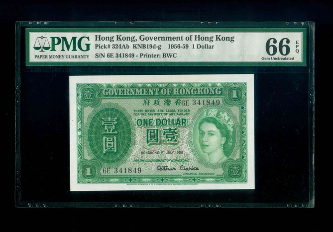 1959 香港政府 $1 PMG 66 EPQ 編號:6E341849(頂級雪白)