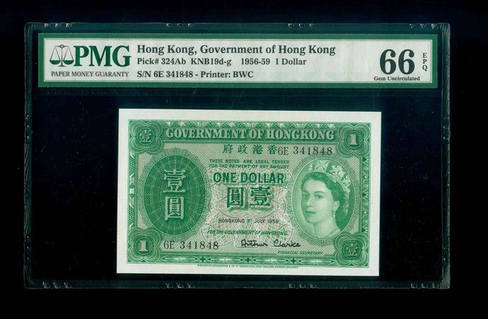 1959 香港政府 $1 PMG 66 EPQ 編號:6E341848(頂級雪白)