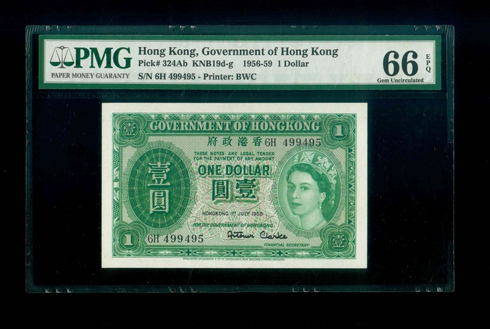 1959 香港政府 $1 PMG 66 EPQ 編號:6E499495(頂級雪白)