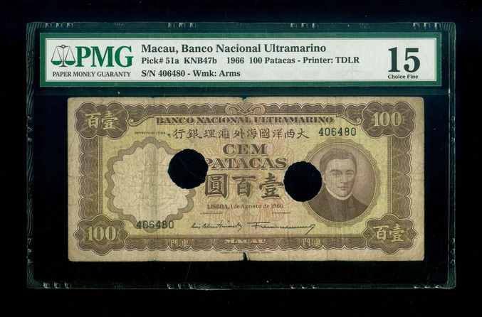 1966 澳門大西洋國海外滙理銀行 100 Patacas PMG 15 編號:406480(Cancelled-Splits)