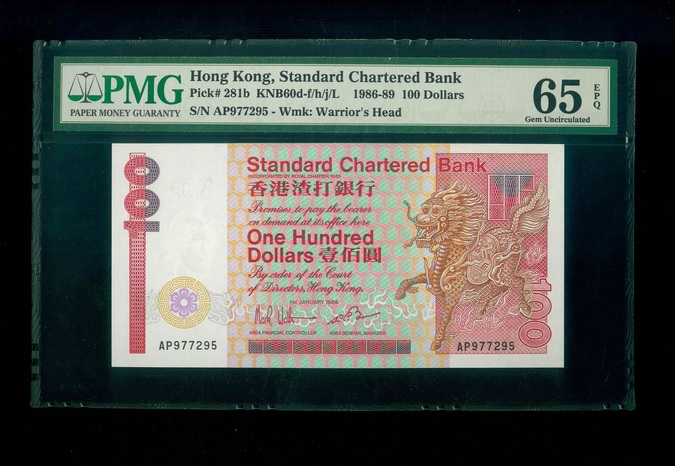 1986 香港渣打銀行 $100 PMG 65 EPQ 編號:AP977295(頂級雪白)