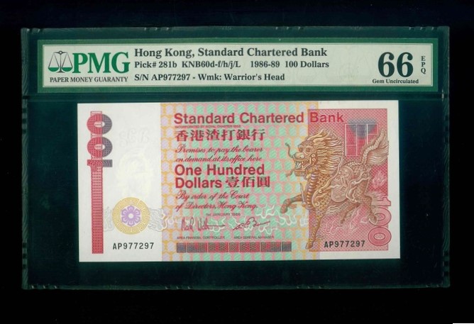 1986 香港渣打銀行 $100 PMG 66 EPQ 編號:AP977297(頂級雪白)