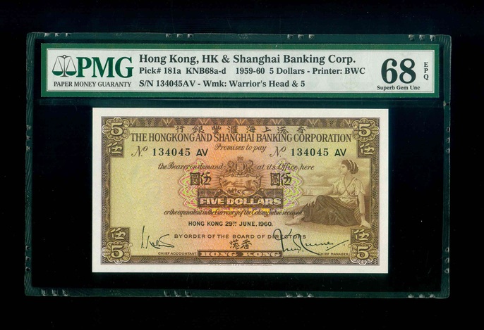 1960 香港上海滙豐銀行 $5 PMG 68 EPQ 編號:134045 AV