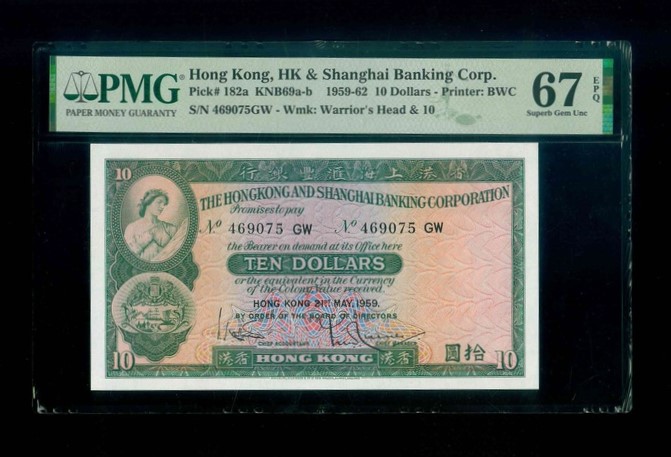 1959 香港上海滙豐銀行 $10 PMG 67 EPQ 編號:469075 GW(頂級雪白)