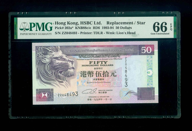 1994 香港上海滙豐銀行 $50 PMG 66 EPQ 編號:ZZ048493(補版系列)