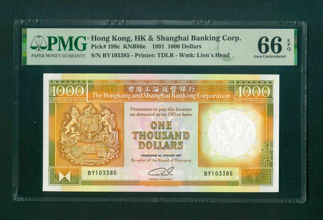 1991 香港上海滙豐銀行 $1000 PMG 66 EPQ 編號: BY103385(頂級雪白)