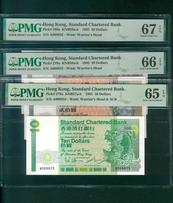 1985 香港渣打銀行 $10 $20 $50 PMG 65-67 EPQ 編號: A008833…(共3張,A版三對子同號,頂級雪白)