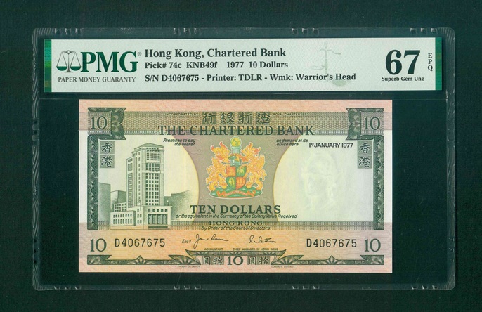 1977 香港渣打銀行 $10 PMG 67 EPQ 編號: D4067675(頂級雪白)