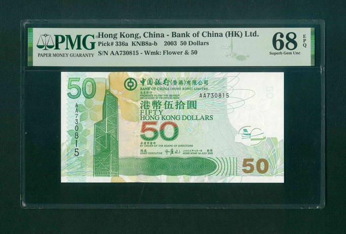 2003 香港中國銀行 $50 PMG 68 EPQ 編號: AA730815(頭版系列,頂級雪白)