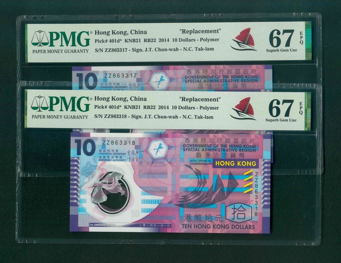 2014 香港特區政府 $10 PMG 67 EPQ 編號: ZZ863317-18(共2張,補版連號,頂級雪白)