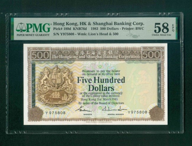 1983 香港上海滙豐銀行 $500 PMG 58 EPQ 編號: Y975808