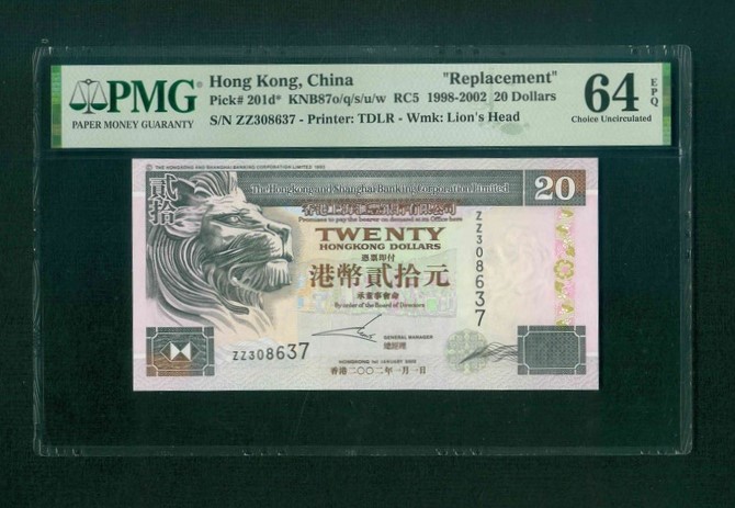 2002 香港上海滙豐銀行 $20 PMG 64 EPQ 編號: ZZ308637(補版系列)