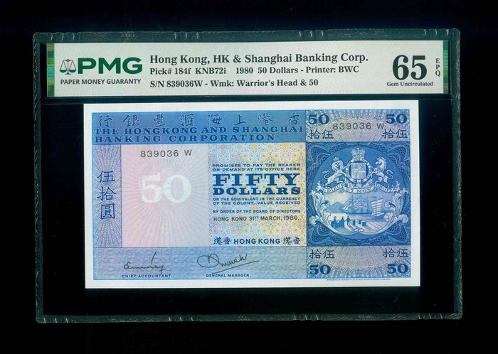 1980 香港上海匯豐銀行$50 PMG 65 EPQ 編號: 839036W