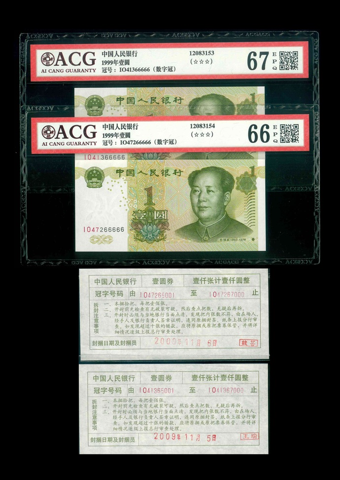 1999 中國人民銀行 $1 ACG 66-67 EPQ 編號:1041366666…(共2張,附簽條,趣味數字冠,頂級雪白)