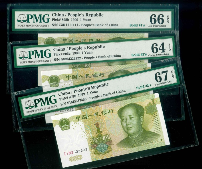 1999/2005 中國人民銀行 $1 $10 PMG 66 EPQ 編號:L91E333333…(共3張,含全3,趣味號,頂級雪白)