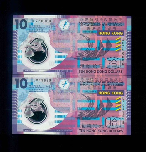 2007 香港特區政府 $10 AU 編號:JU750000/LZ049999(共2張,獅子含75萬號)