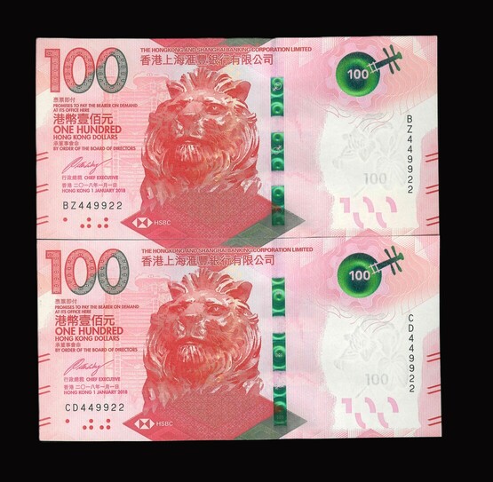 2018 香港上海滙豐銀行 $100 UNC 編號:BZ/CD 449922(共2張,同號三對子)