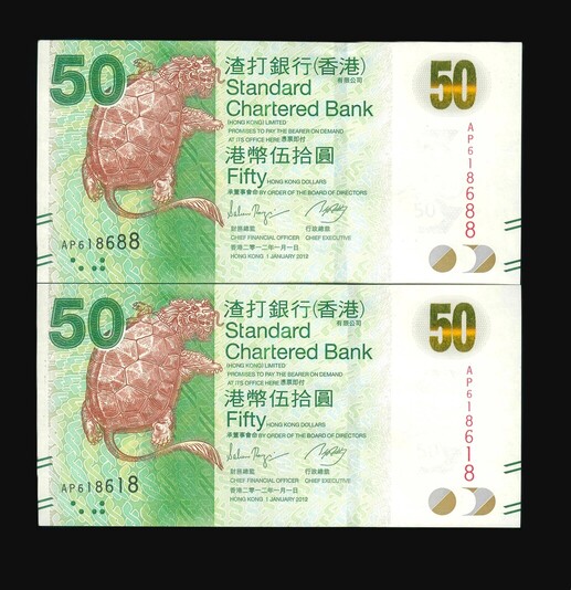 2012 香港渣打銀行 $50 UNC 編號:AP618618…(共2張,含重複號,8尾)