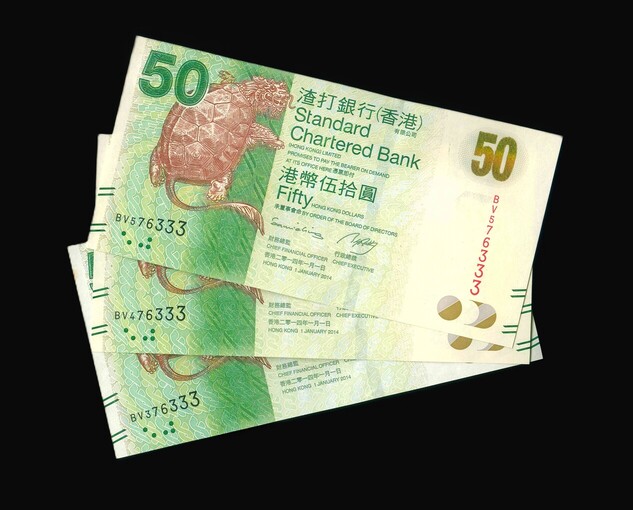 2014 香港渣打銀行 $50 UNC 編號:BV576333…(共3張,趣味豹子號)