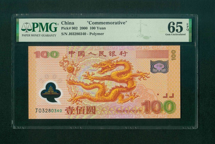2000 中國人民銀行千禧紀念鈔 $100 PMG 65 EPQ 編號: J03280340(頂級雪白)