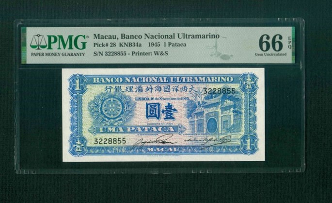 1945 澳門大西洋國海外滙理銀行 1 Pataca PMG 66 EPQ 編號: 3228855