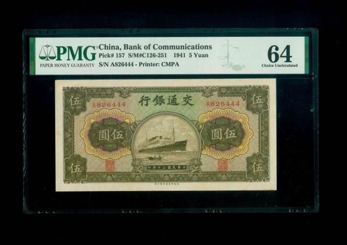 1941 交通銀行 $5 PMG 64 編號: A826444(豹子號)
