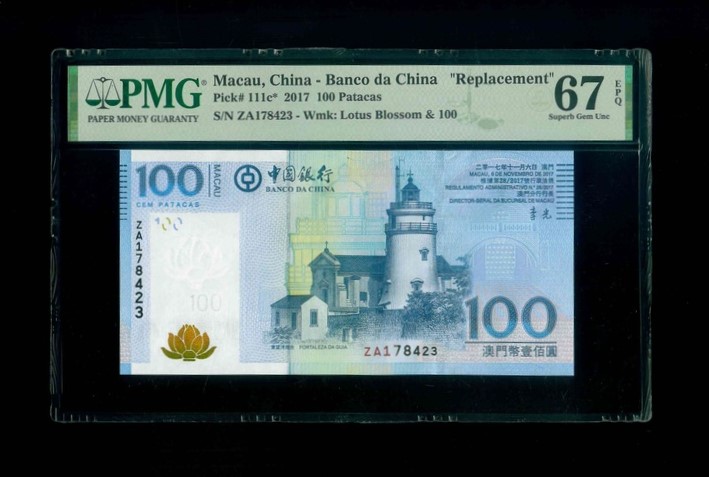2017 澳門中國銀行 100 Patacas PMG 67 EPQ 編號: ZA178423(補版系列,頂級雪白)