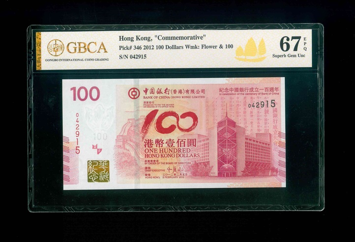 2012 香港中國銀行成立百周年紀念 $100 GBCA 67 EPQ 編號: 042915