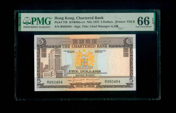 1975ND 香港渣打銀行 $5 PMG 66 EPQ 編號: R950484(頂級雪白)