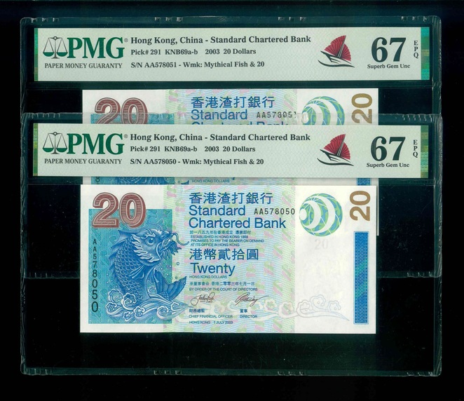 2003 香港渣打銀行 $10 PMG 67 EPQ 編號: AA578050-51(共2張,連號,頂級雪白)
