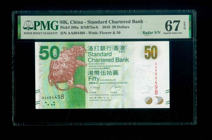 2010 香港渣打銀行 $50 PMG 67 EPQ 編號: AA894498(頭版雷達號,頂級雪白)