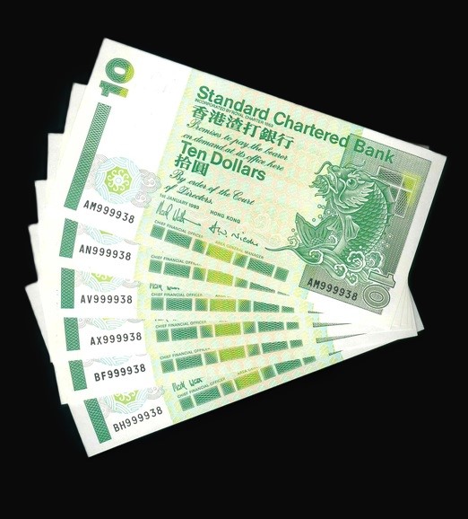 1993 香港渣打銀行 $10 UNC 編號:AM999938…(共6張,趣味同號)