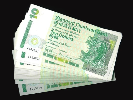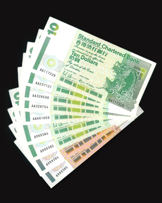 1993 香港渣打銀行 $10 UNC 編號:A443601-50(共50張,連號,頂級雪白)
