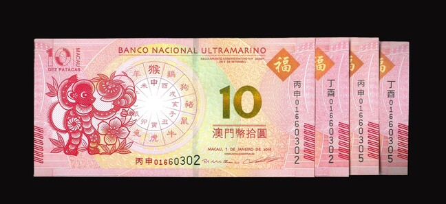 2016 澳門大西洋銀行生肖鈔 10 Patacas UNC 編號:01660302/05…(共4張,2組各同號)