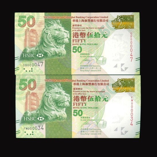 2016 香港上海滙豐銀行 $50 UNC 編號:GB 000047/FM 000034(共2張)