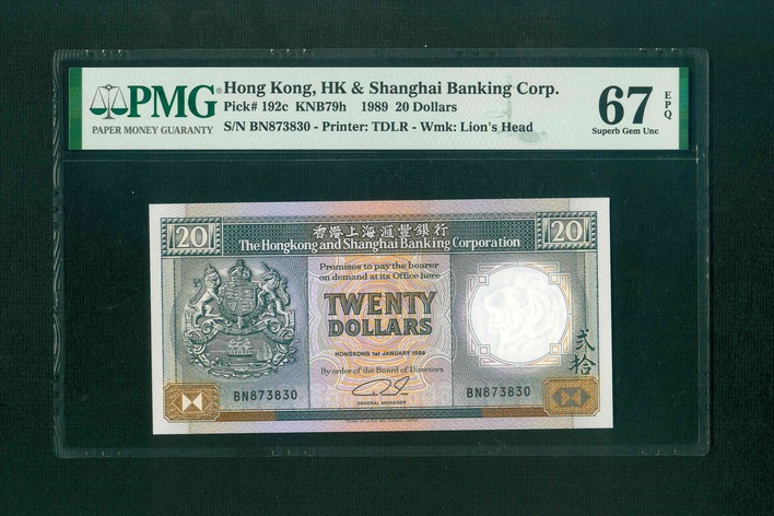 1989 香港上海滙豐銀行 $20 PMG 67 EPQ 編號:BN873830(頂級雪白)