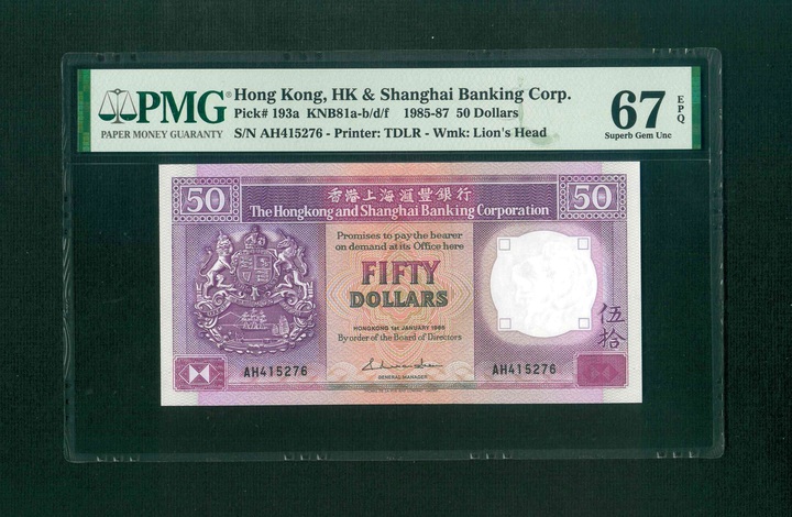 1986 香港上海滙豐銀行 $50 PMG 67 EPQ 編號:AH415276(頂級雪白,紙胆系列)