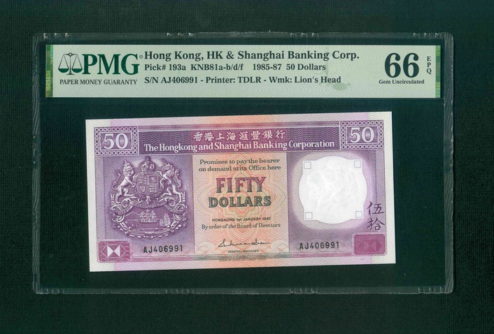 1987 香港上海滙豐銀行 $50 PMG 66 EPQ 編號:AJ406991(頂級雪白)