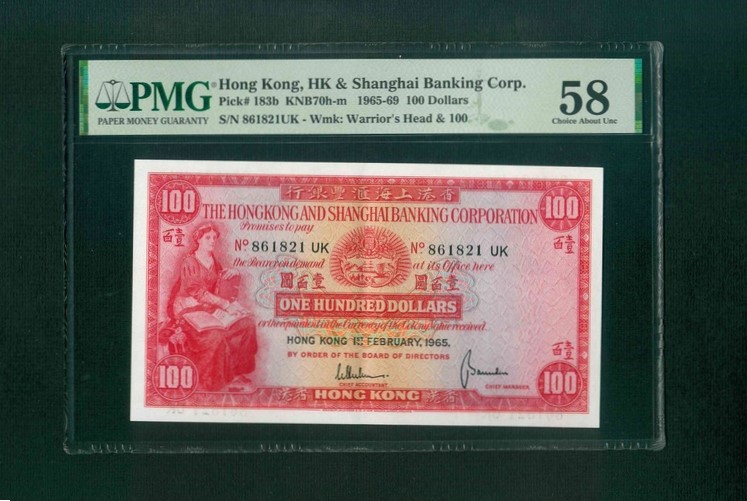 1965 香港上海滙豐銀行 $100 PMG 58 編號:861821 UK