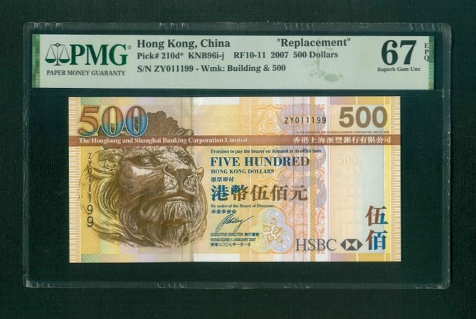 2007 香港上海滙豐銀行 $500 PMG 67 EPQ 編號:ZY011199(補版系列,頂級雪白)