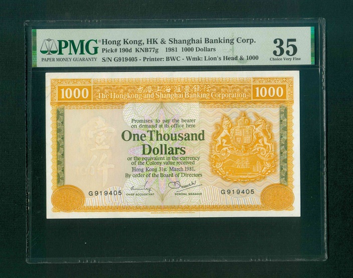 1981 香港上海滙豐銀行 $1000 PMG 35 編號:G919405