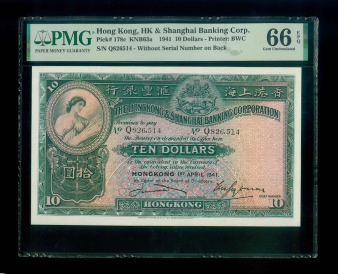 1941 香港上海滙豐銀行 $10 PMG 66 EPQ 編號:Q826514(頂級雪白)
