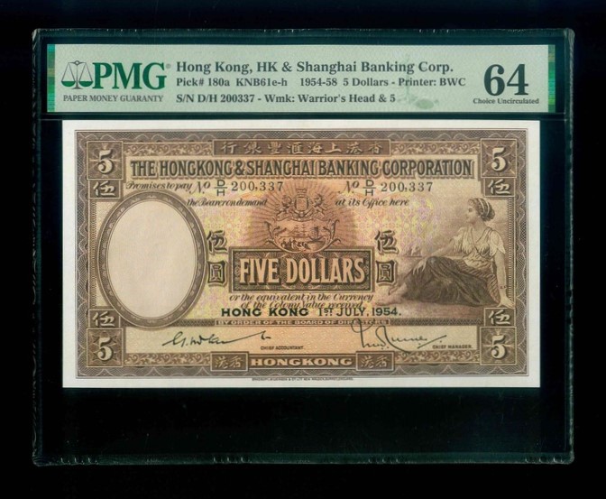 1954 香港上海滙豐銀行 $5 PMG 64 編號:D/H 200337