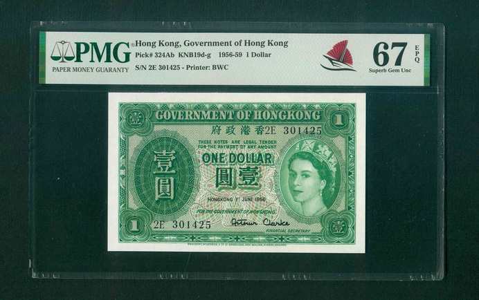 1956 香港政府 $1 PMG 67 EPQ 編號: 2E 301425(頂級雪白)