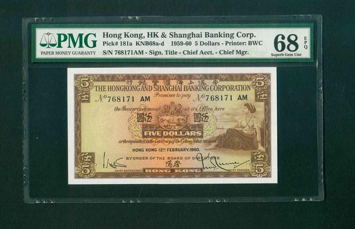 1960 香港上海滙豐銀行 $5 PMG 68 EPQ 編號: 768171 AM(頂級雪白)