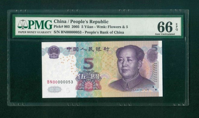 2005 中國人民銀行 $5 PMG 66 EPQ 編號: BN00000053(頂級雪白)