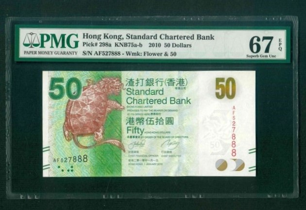 2010 香港渣打銀行 $50 PMG 67 EPQ 編號: AF527888(豹子號)