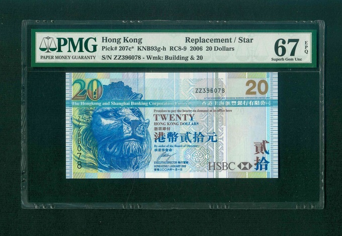 2006 香港上海滙豐銀行 $20 PMG 67 EPQ 編號: ZZ396078(補版系列,頂級雪白)