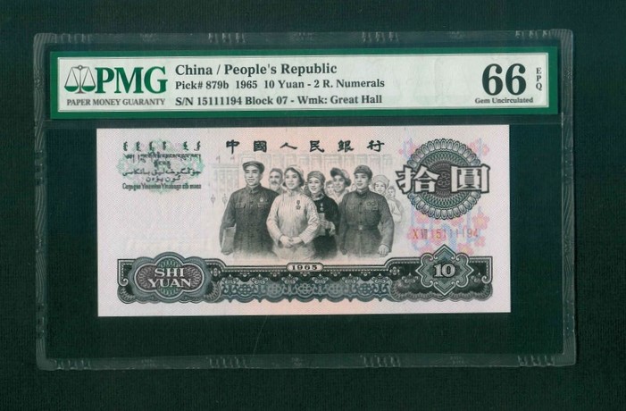 1965 中國人民銀行 $10 PMG 66 EPQ 編號: X VII 15111194(頂級雪白)