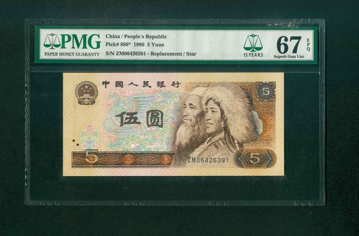 1980 中國人民銀行 $5 PMG 67 EPQ 編號: ZM06426391(補版系列,頂級雪白)